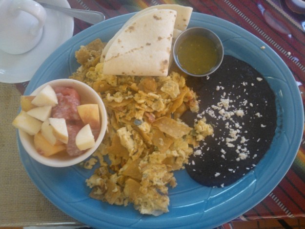 So today when we went to Cafe Kacao, a Guatemalan breakfast place here in OKC, and I saw a similar dish, I had to try it. What they called Migallas, was almost a perfect replica of the breakfast dish I thoroughly enjoyed in Mexico. A combination of chips, eggs, jalapenos, queso fresco, and red and green peppers, Migallas was was well flavored and filling.