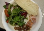 With Italy on the brain after reading all those postcards, I thought some “authentic” Italian cuisine might be fun.  Our menu consisted of a caprese salad (I added mixed greens to make it more substantial), procuitto and melon, bread, roasted almonds, and watermelon granita.  These probably aren’t the dishes that most people think of when it comes to Italian food, but they are some of my favorites.  Plus, they don’t require a stove (which I don’t have in the office).